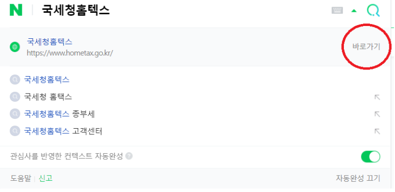 ▶ 네이버 검색창에 국세청 홈택스 검색 후 바로 이동