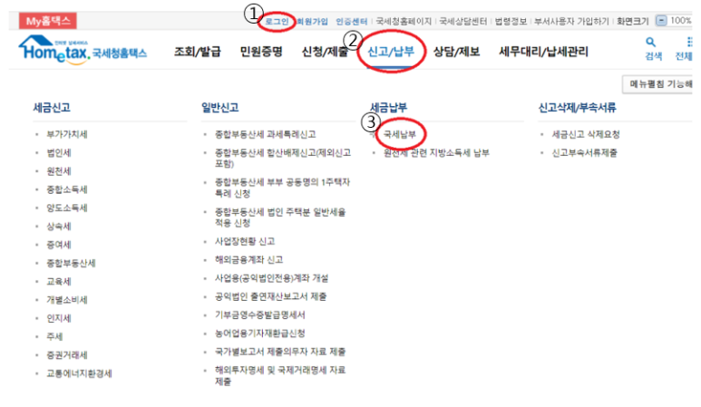 로그인 하셨다면 2번 신고/ 납부에 화살표를 갖다 대면 세금납부 - 국세납부가 보여요. 여기를 클릭하세요.