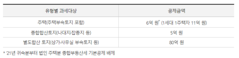 ▶ 종부세 과세 대상 : 공시가 합계액이 6억원 초과 하는 자 (단, 1세대 1주택자는 11억 원)