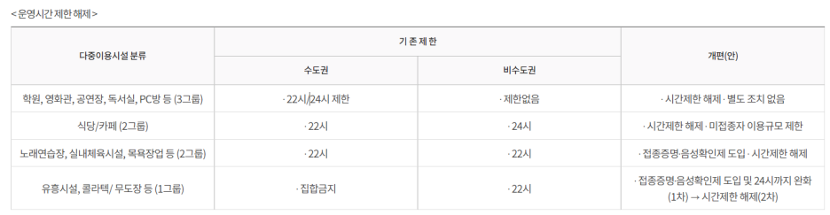 생업시설 애로를 고려하여 1차 개편부터 모든 시설의 시간제한을 해제하되,
