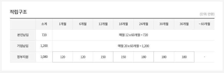 청년 : 5년간 720만원 적립(최소 월 12만원 × 60개월)