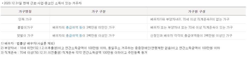 단독가구 2,200만원, 홑벌이 가구 3,200만원, 맞벌이가구 3,800만원 미만이어야 하며,