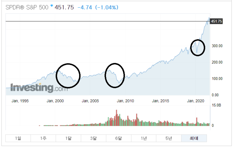 2000년대 닷컴버블, 2008년 경제 위기 때 주가가 많이 하락했다.