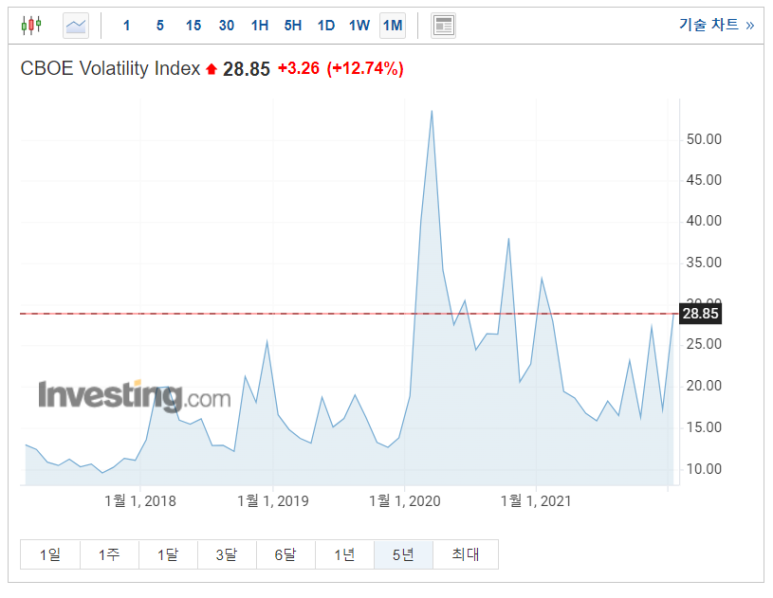 CBOE VIX 지수는 28.85로 무려 12.74%가 올랐다.