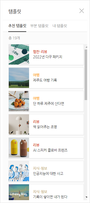 템플릿을 누르면 아래와 같이 추천 템플릿, 부분 템플릿, 내 템플릿이 나옵니다.