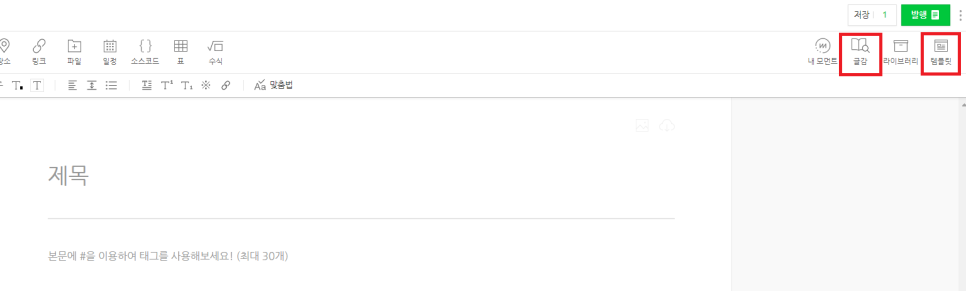 그럼 우측 상단에 보시면 발행 버튼 밑에 <템플릿>이 있습니다.