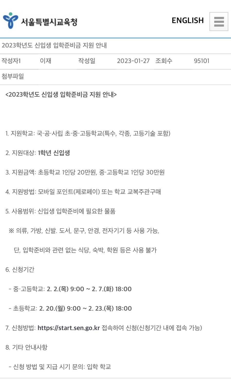 서울시에서 초중고 신입생 입학준비금을 지원해줍니다.