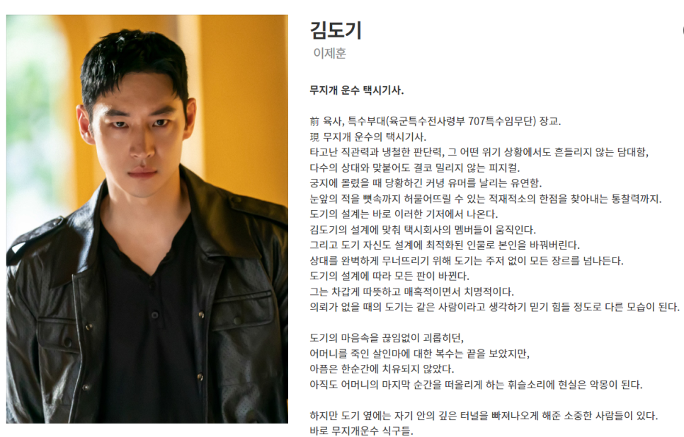 택시회사 무지개 운수는 설계자 이제훈을 중심으로 복수를 대행해 주는 회사입니다.