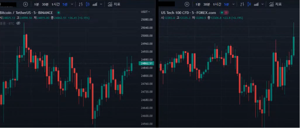 오른쪽이 나스닥이고, 왼쪽은 비트코인입니다.