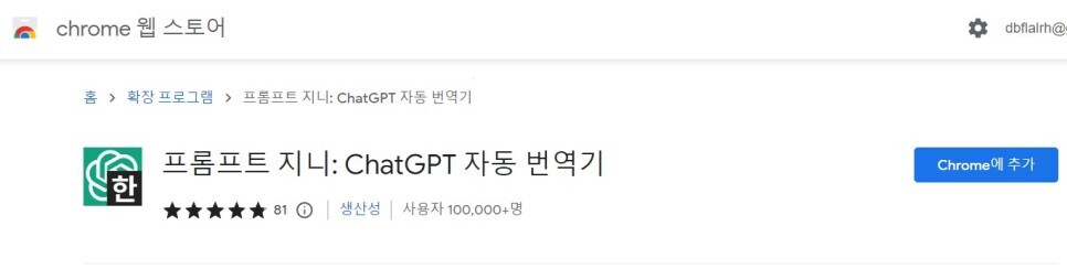우선, 구글에서 크롬 웹스토어를 검색하셔서 들어가셔서 프롬프트 지니를 검색 후 크롬에 추가를 하시면 간단하게 다운 받을 수 있어요.