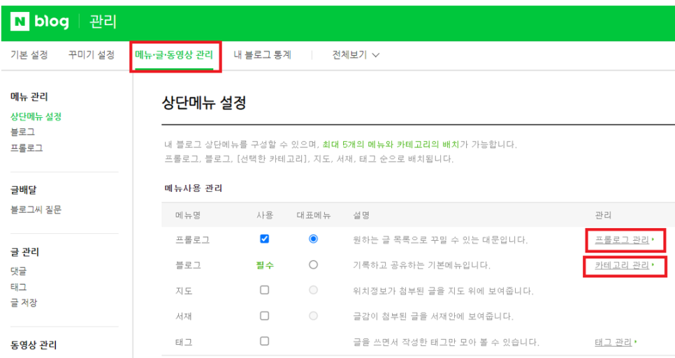 그리고 상단에 보시면 메뉴, 글, 동영상 관리를 클릭하시면 프롤로그 관리와 카테고리 관리가 있습니다.