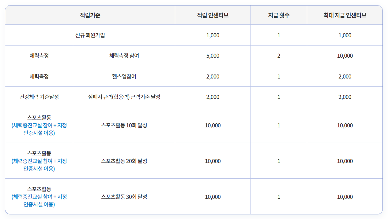 스포츠활동 인센티브는 연간 최대 50,000P 까지 적립 가능합니다. (전환은 10,000p 단위로 가능합니다.)