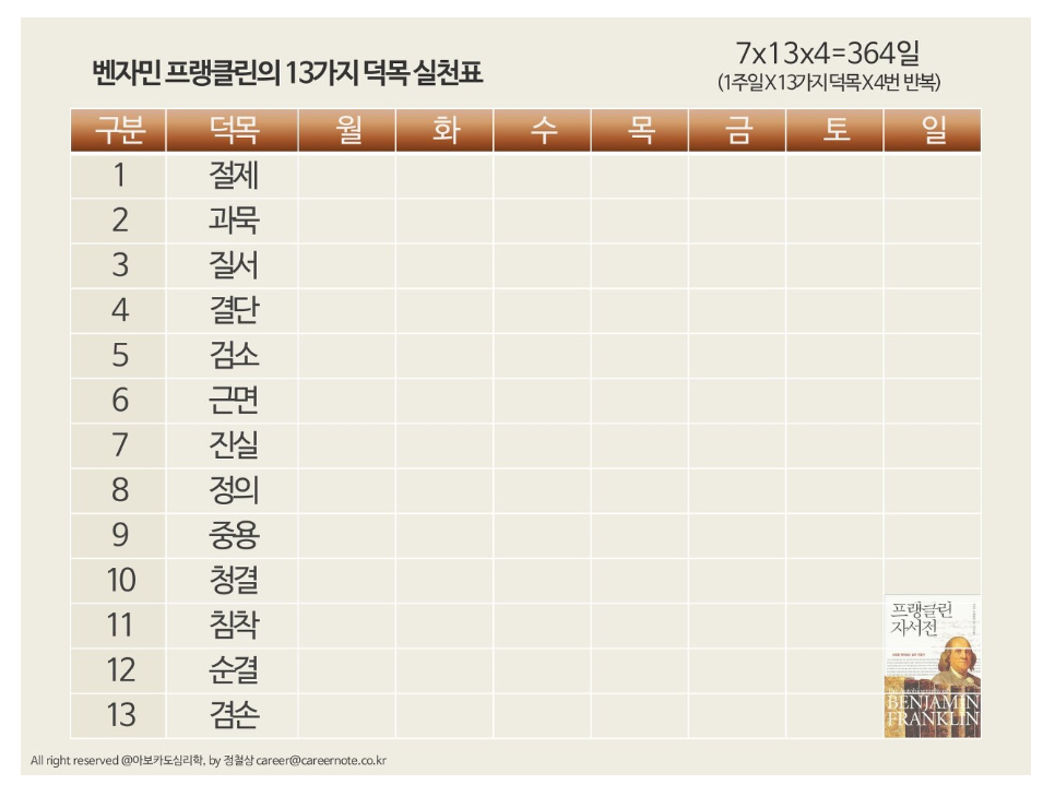 표는 첫째주에는 절제를, 둘째주에는 과묵... 이렇게 13주를 4번 반복하면 364일이 된다.