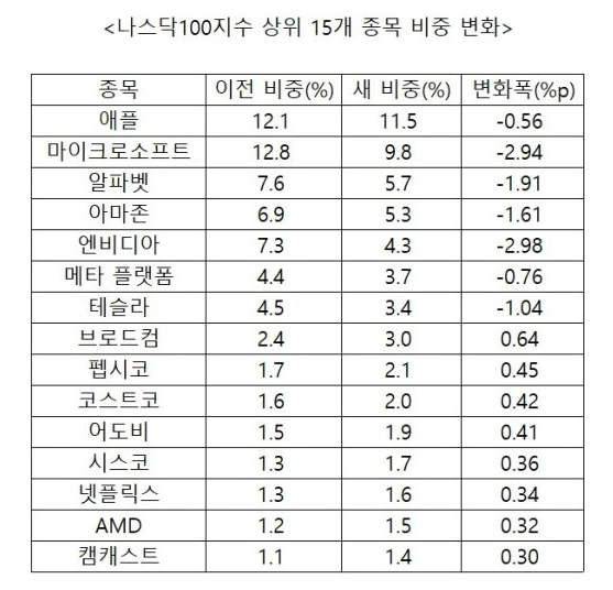 셋째, 나스닥100지수 내에서 비중이 가장 높았던 마이크로소프트는 비중이 12.8%에서 9.8%로 떨어져 2위로 내려가고 2번째로 비중이 높았던 애플은 12.1%에서 11.5%로 줄어 비중이 가장 높은 종목으로 올라갔다.