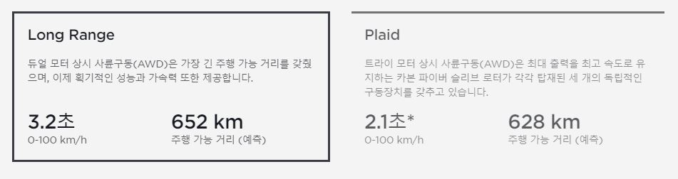 모델 S의 종류는 롱 레인지, 플레이드 2가지가 있어요~!