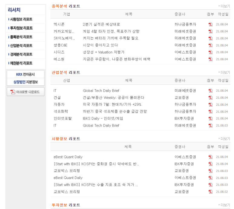 리포트에는 시황정보, 투자정보, 종목분석, 산업분석, 경제분석, 채권분석 등