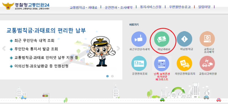 홈페이지에 아래 처럼 빨간 동그라미로 표시된 미납 과태료를 클릭합니다.